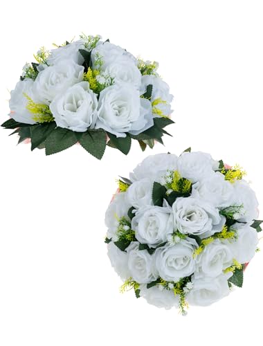 Nuptio Blomma Boll Arrangemang Bukett - 2 Stycken 40cm Diameter Vita Falska Blommor Rosor Bollar för Centerpieces Bord - Stora Konstgjorda Ros Arrangemang Blomma Bukett för Bröllop Dekorationer