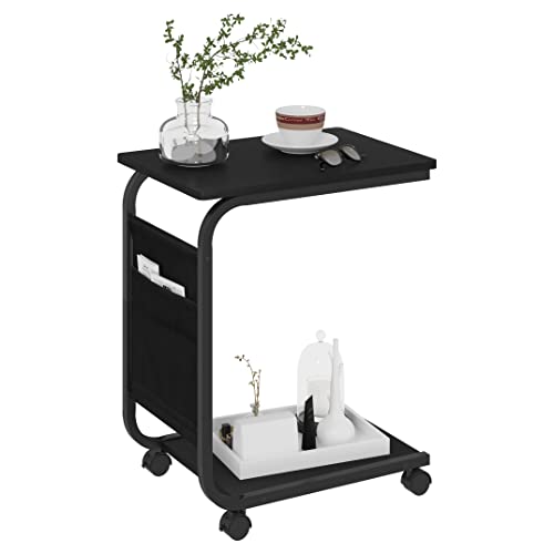 WOLTU Soffbord, bord med 2 hyllor och 1 sidoficka, C-format vardagsrumsbord, på hjul, för bäddsoffa, trä, spånskiva och metall, 50 x 35 x 62 cm, svart BTS04sz
