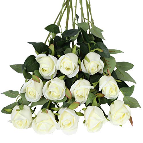 Tifuly Konstgjorda blommor, 12 st., enkel lång stjälk, falsk ros i siden, brudbukett, realistisk blomma för bröllopsfest, hem, bordsdekoration bordsuppsatser (rosenknoppar, vita)