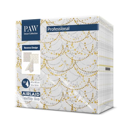 PAW - Airlaid servetter (40 x 40 cm) I 50 stycken I perfekt för bröllop, dop, nattvard, födelsedag I högkvalitativ bordsdekoration bakmönster I servetter tyg I omvänd motiv guld-vit
