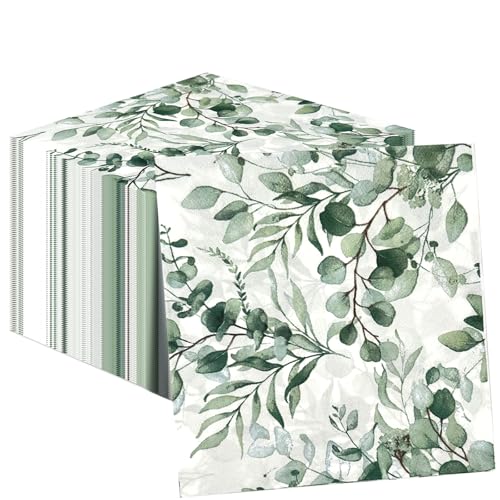 GOTRUST 100 st servetter eukalyptus, 2-lagers servetter bröllop grön vit, bordsdekoration pappersservetter eukalyptus för nattvardsgång dop födelsedagar fester baby shower trädgård