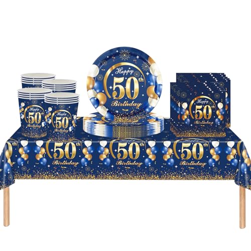 53 st marinblå Happy 50th Birthday Party servis plast bordsduk, papperstallrikar, servetter och koppar för man födelsedag bordsdekorationer engångsfest servis set för vuxna födelsedagsfest