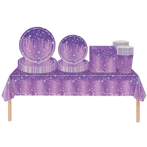69 st lila glänsande glitter diamant festservis set plast bordsduk, papperstallrikar servetter och koppar engångsservis för barn vuxna födelsedag, jul halloween lila festdekorationer