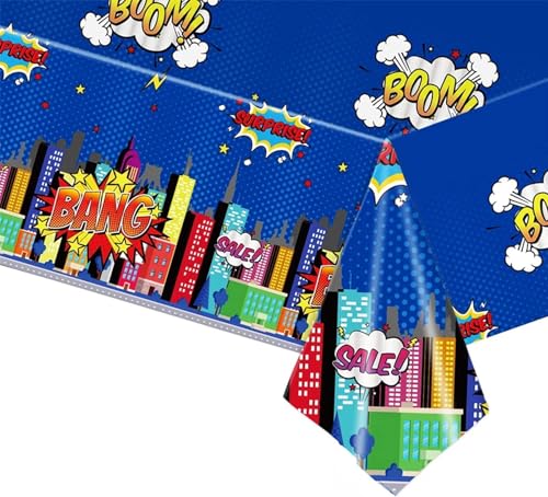 POPOYU 130 x 220 cm superhjältar bordsduk, blå Marv bordsduk, marv party bordsduk för pojkar, plast Marv, Spiderman, stad – bordsduk, fest för barns födelsedag dekoration