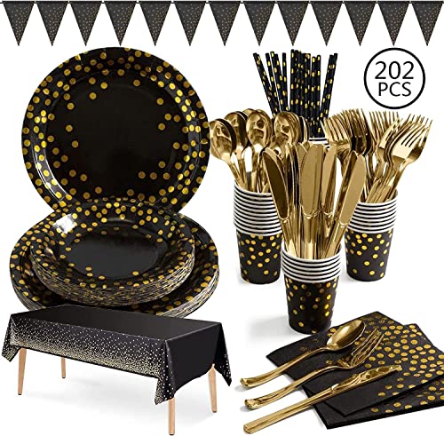 Set i guld och svart med 202 festtillbehör, miljövänliga engångstallrikar, bestick, servetter, koppar, bordsduk, icke-plast, middagsservis för bröllop, födelsedag, årsdagar och examen