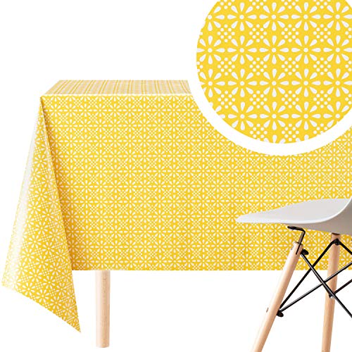 KP HOME Vattentät PVC-bordsduk som kan torkas ren - rektangulär vaxduk 98 x 140 cm | 250 x 140 cm - retro blommigt tryck kan torkas av bordsduk - plast utomhus avtorkningsbart bordsskydd i gult
