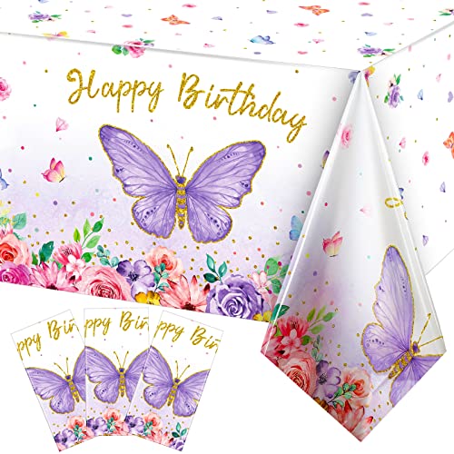 Fjäril festdekorationer, fjäril födelsedag bordsduk rektangulär akvarell lila fjäril bordsskydd vårtema plast bordsduk för flickfest, 250 x 137 cm (108 x 54 tum) rosa, lila, 3 delar)
