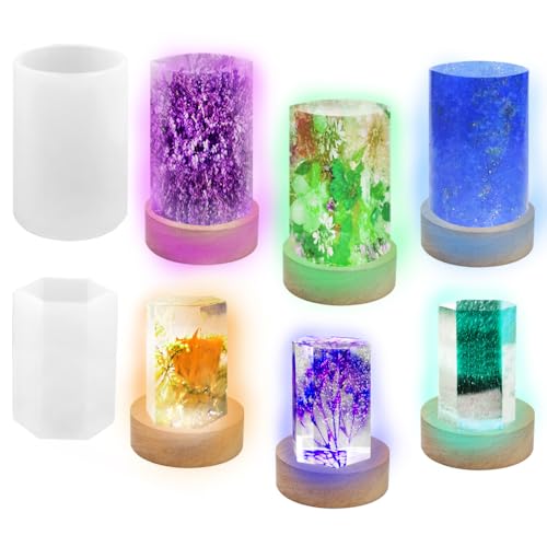 2 st harts silikonform, AFUNTA cylindrisk epoxihartsform, sexkantig hartsform och träglödande bas med USB-kraft för gör-det-själv skrivbord, dekoration, bordslampa heminredning
