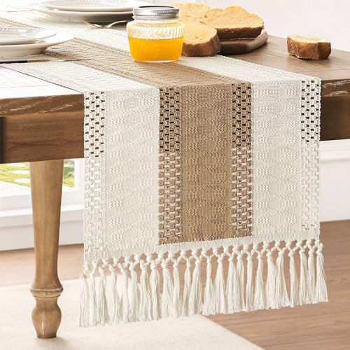 ZeeMart Bordslöpare i makramé stil, 35 x 183 cm brun/elfenben, boho neutrala bordslöpare 183 cm lång, bondgårdsvävd heminredning