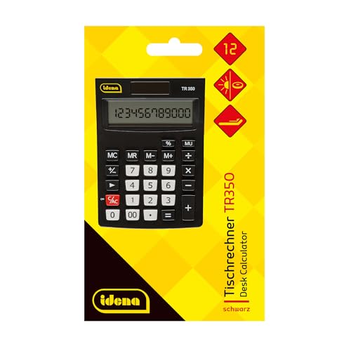 Idena 11095 – Bordsräknare TR350 i svart, miniräknare soldriven inklusive batteri, kontorsräknare i svart med 12-siffrig vinklad skärm, ca 14,4 x 10,3 x 2 cm