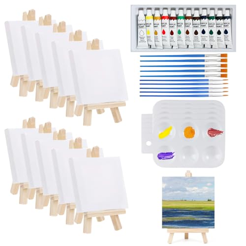 TOPBELIEF 10 x miniduk med staffli, bordsstaffli set, duk 10 x 10 cm, med 12 färgglada akrylfärger, penslar, rektangulär palett för ritning, målning, hantverk