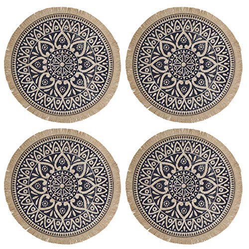 Kreativa toppar set med 4 jute-bordstabletter med mandala design, naturligt tryckta hessiska runda bordsmattor, blå, 41 cm