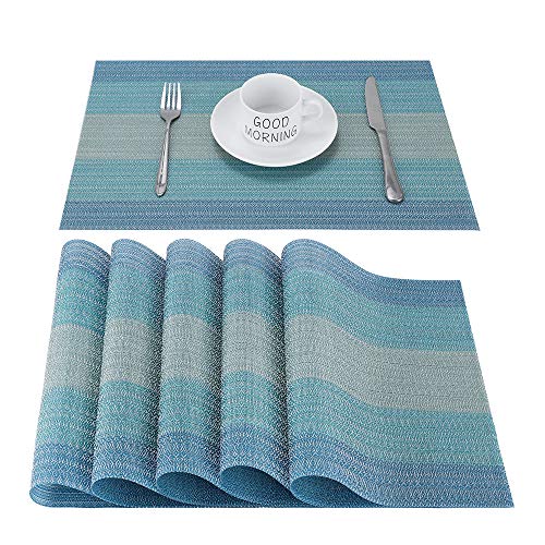 CHAOCHI Bordstabletter Uppsättning av 6 Tvättbara Korsväv Vävda Vinyl PVC Placeringsmattor, Enkla att Rengöra Halkfria Värmebeständiga Matbordsmattor, 45 cm x 30 cm (Gradient blå)