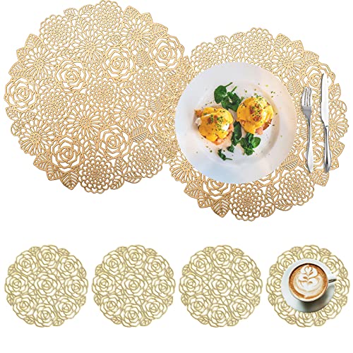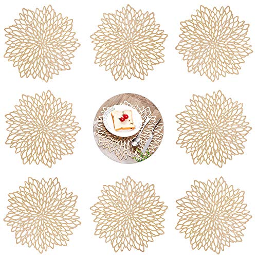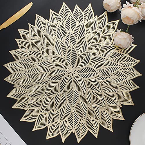 Mabbcoo Runda bordstabletter i set om 6, ihåliga blommor, bordsunderlägg för matbord, pressad vinyl, blommande blad, bordsmattor för semester, fest, bröllop, accent, bordsdekoration, guld