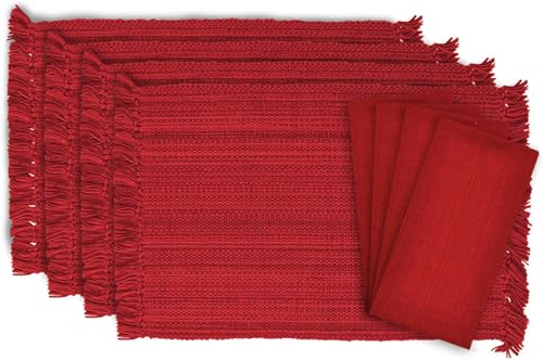 DII Tonal Fransad Linne Set, 4 bordstabletter & 4 Servetter, tango-röd - Perfekt för höst, middagar, grillning, jul, bröllop och daglig användning