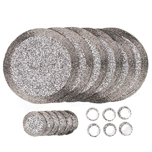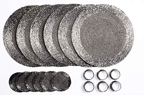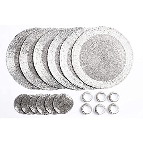 Penguin Home® Set med 12 glasunderlägg och servettringar i glaspärlor – antik silverfärg – runda bordstabletter – handgjorda av skickliga indiska hantverkare – diameter – 32 cm (13 tum)