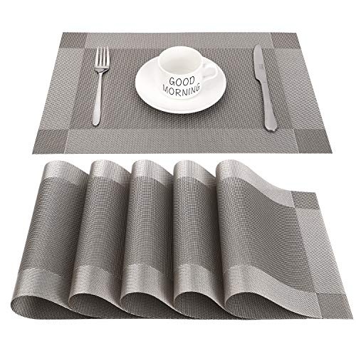 CHAOCHI Bordstabletter Uppsättning av 6 Tvättbara Korsväv Vävda Vinyl PVC Placeringsmattor, Enkla att Rengöra Halkfria Värmebeständiga Matbordsmattor, 45 cm x 30 cm (Silver/Grå)