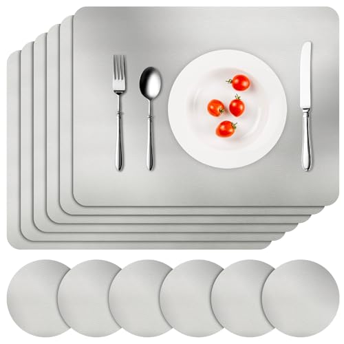 APLKER Läderbordstabletter set med 6 amerikanska bordstabletter tvättbara vattentäta halkfria värmebeständiga, rektangulära bordstabletter, 16 tum x 12 tum (silver)