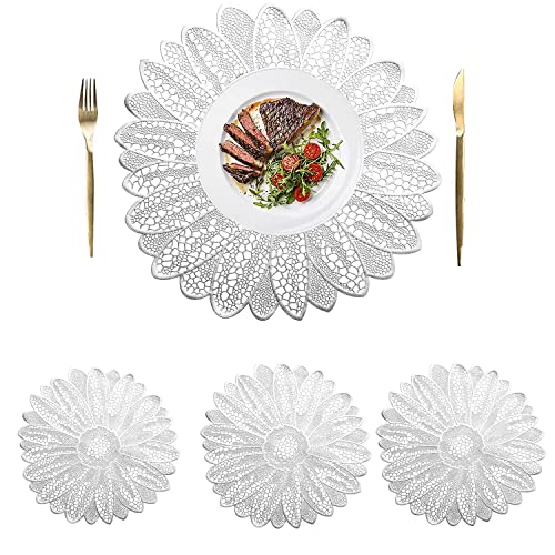 4-pack runda pressade vinylbordsunderlägg, 38 cm dekorativa bordsunderlägg, halkfri tvättbar bröllopsaccent mittpunkt, metallisk bordstablett för matbord köksdekor (silver)