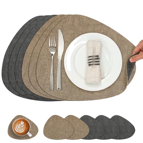 Myir JUN Läder bordstabletter och underlägg set med 4, bordsmattor runda vattentäta dubbelsidiga kökstabletter kaffe mattor värmetåliga bordsunderlägg halkfria tvättbara (set med 4, grå beige)