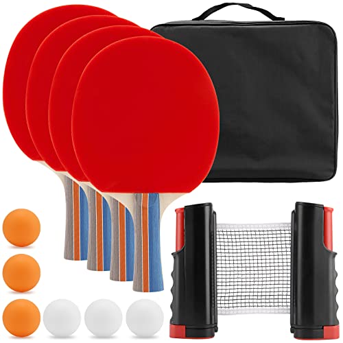 NIRBUN Bordtennisset med utdragbart nät - Professionella bordtennisracket - 3-stjärniga bordtennisbollar - Justerbart bordspingisnät - Bärbart pingisset (4 spelare set)