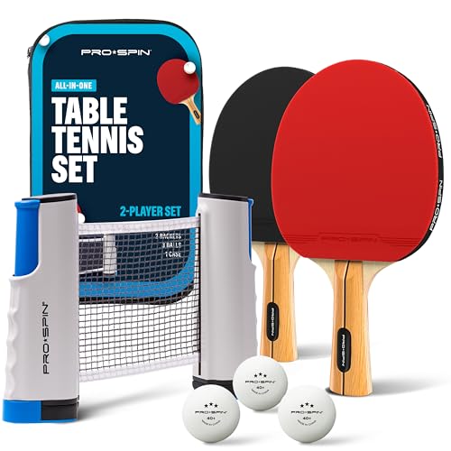 PRO SPIN Bärbart bordtennisset | 2-spelare premium allt-i-ett-kit med infällbart bordtennisnät för alla bord, fladdermöss, 3-stjärniga pingisbollar och förvaringsfodral | och inomhus/utomhusspel