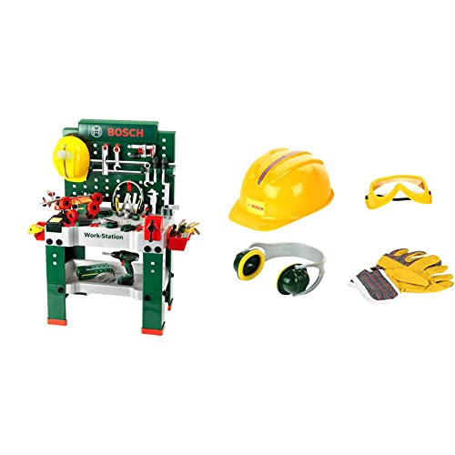 Theo Klein 8485 Bosch arbetsbänk nr. 1 | Inkl. batteridriven skruvdragare och mycket annat & Theo Klein 8537 Bosch tillbehörset | Högkvalitativa arbetshandskar, skyddsglasögon, hörselskydd och hjälm