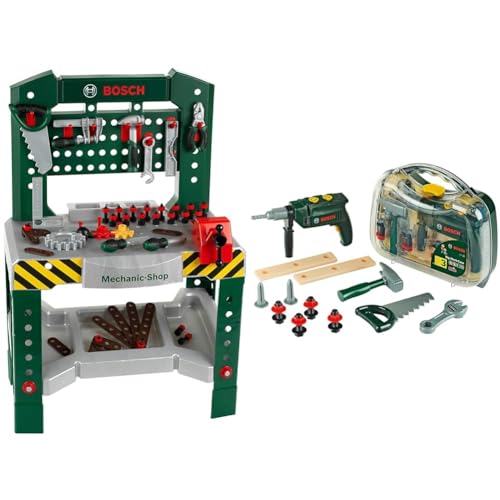 Theo Klein 8485 Bosch arbetsbänk nr. 1 | Inkl. batteridriven skruvdragare | Leksak för barn från 3 år & Theo Klein 8416 Bosch verktygsväska | Verktygssats i 16 delar | Leksak för barn från 3 år