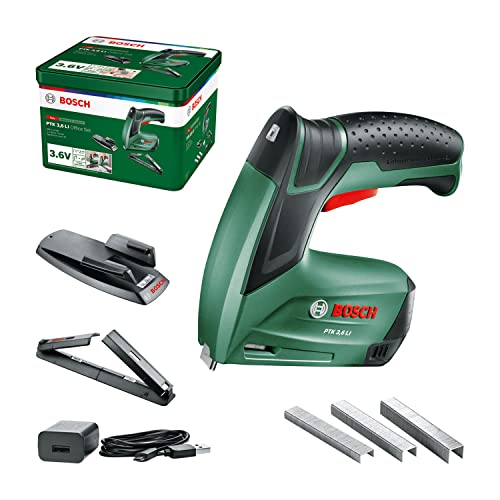 Bosch Home and Garden Bosch DIY Tools 0603968202 Bosch Häftapparat PTK 3,6 LI Office Set med pappershäftapparat och häftapparat (integrerat batteri, 3,6 volt, häftapparat, 30 slag/min, i metallburk), multicolor