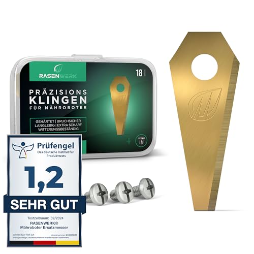 RASENWERK® - Högkvalitativa robotgräsklipparklingor med matchande skruvar - Universella ersättningsblad för Bosch Indego - Blad i titankarbidlegering - Set med robotgräsklipparklingor - 18 Stycken