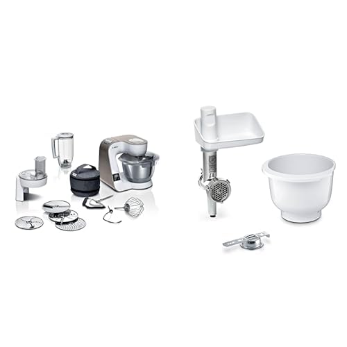 Bosch MUM5 1000W - Köksmaskin med 7 hastigheter, EasyArmLift och integrerad hushållsvåg och timer, konditorset ingår, vit & Bosch MUZ5Bs1 Lifestyle Set Bakingsensation med Bunke och Kvarn