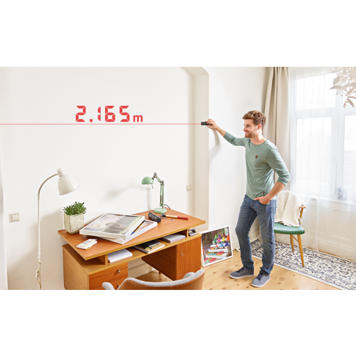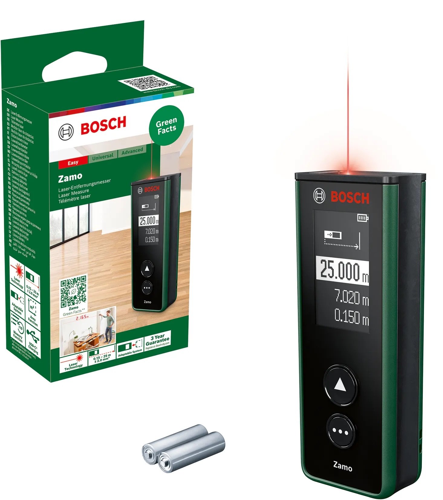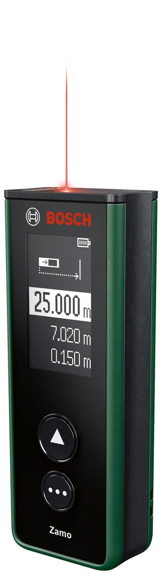 Fjärde generationens laseravståndsmätare Zamo från Bosch (enkel och exakt mätning upp till 25 m, laddningsbara batterier via USB-C®, med tillsatsfunktion, i e-handelskartong)