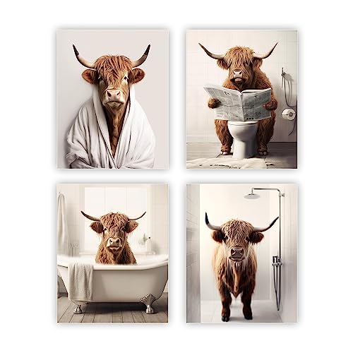 heilkee Rolig Highland ko badrumsdekor djur badrum väggkonst brun boskap i badkar bild rustik bondgårdsstil affischer tryck ko i toalettdekorationer set med 4 (utan ram 20 x 25 cm)