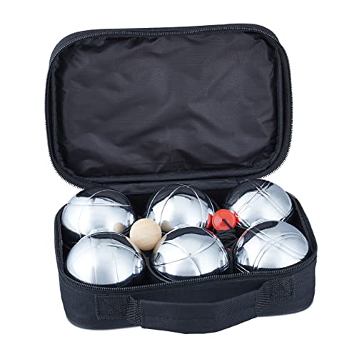 Relaxdays Boule-set, 6 Boccia-kulor av metall, målkula och avståndskniv, petanque med bärväska, silver/svart