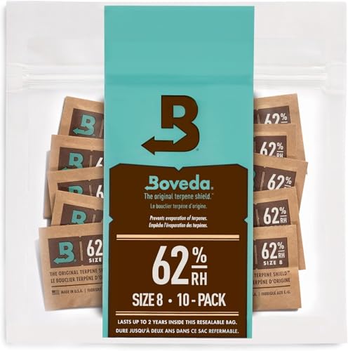 Boveda lagring för örtväxer | 62% RH 2-vägs luftfuktighetskontroll | Storlek 4 upp till 15 gram | Förhindrar att terpenerna torkar eller möglar | 10 återförslutningsbara påsar