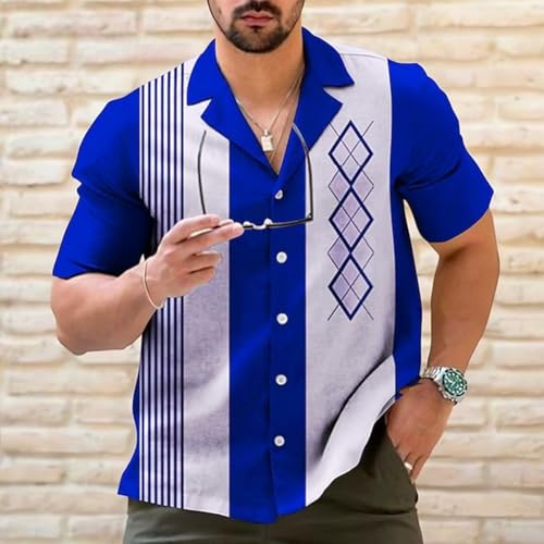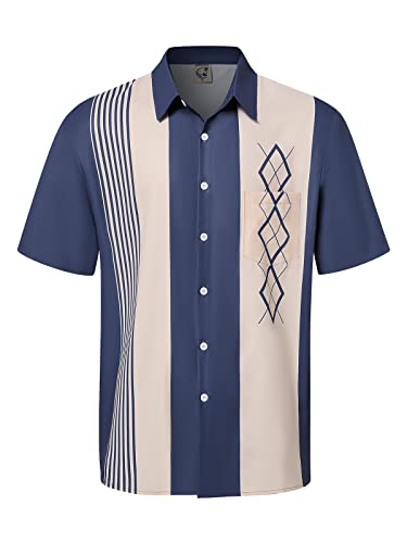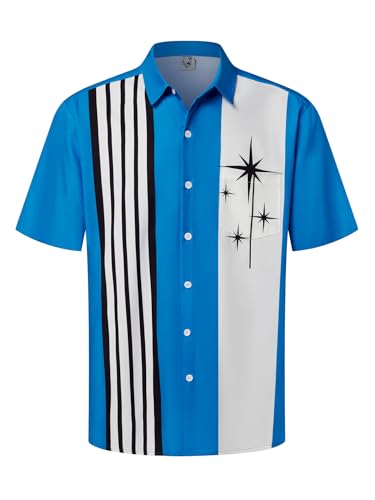 Retro randig bowlingskjorta för män, ledig vintage kortärmad button down (XL safir)