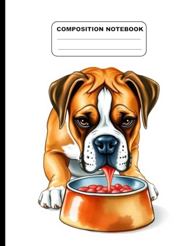 Drawing Of A Boxer Dog Eating From Dog Bowl College Ruled Composition NoteBook: Glossy Paperback Notebook: 120 Pages Size 8.5 Inches By 11 Inches