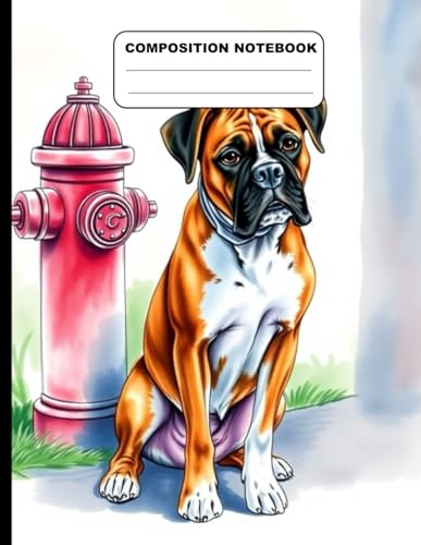 Drawing Of A Boxer Dog Sitting Next To A Fire Hydrant College Ruled Composition NoteBook: Glossy Paperback Notebook: 120 Pages Size 8.5 Inches By 11 Inches