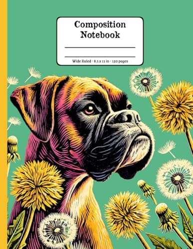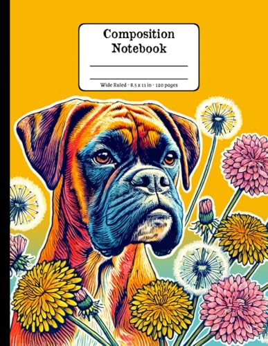 Boxer Dog Joys and Wildflowers Wide Ruled Paper Composition Notebook: Boxer Dog Dandelion Flowers Floral Diary Journal Notebook; 8.5x11 inch with 120 Lined Page