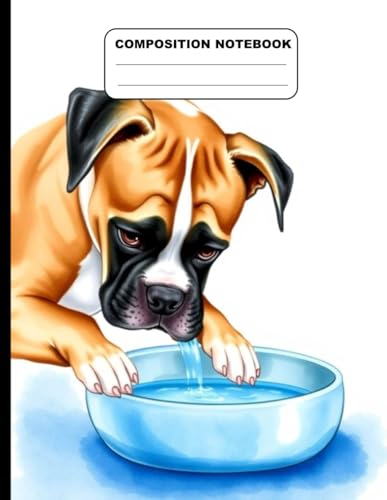 Drawing Of Boxer Dog Drinking From Water Bowl College Ruled Composition NoteBook: Glossy Paperback Notebook: 120 Pages Size 8.5 Inches By 11 Inches