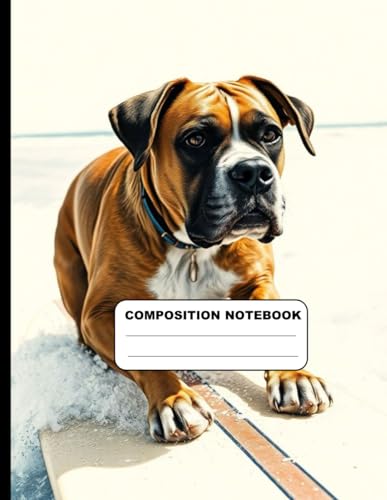 Drawing Of An Adventurous Boxer Dog Surfing College Ruled Composition NoteBook: Glossy Paperback Notebook: 120 Pages Size 8.5 Inches By 11 Inches