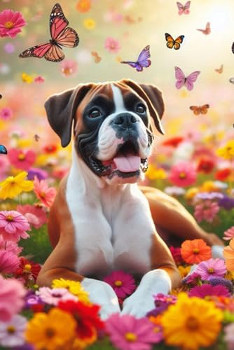Boxer Dog in a field of colorful flowers Notebook - Large 6 x 9 inches - 127 Pages