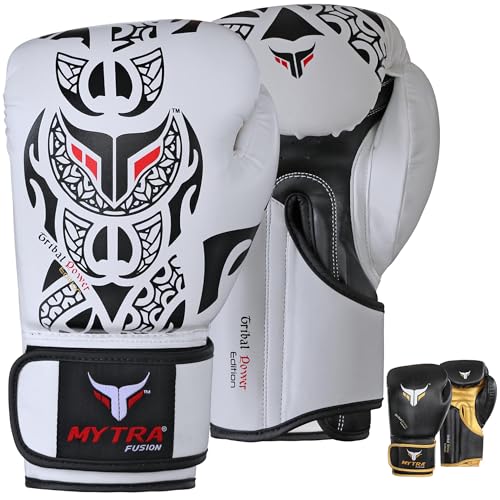 Mytra Fusion Boxningshandskar för Herr & Dam – Tribal Power Edition, Tränings-, Stans-, MMA-, Muay Thai-, Kickboxnings- & Sparringhandskar med Grepp, Luftventiler (White, 18-oz)