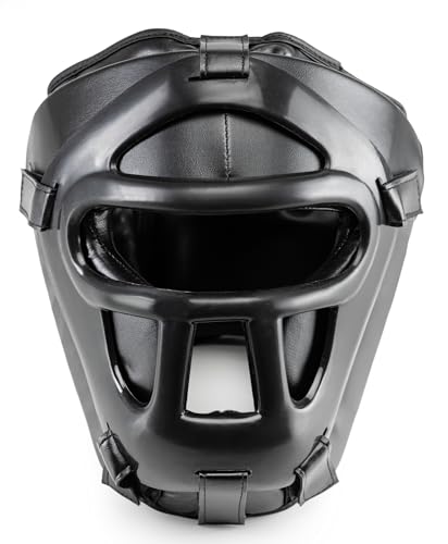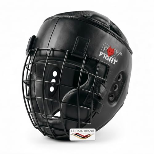 Räv huvudskydd med metallnät framsida för ansiktskydd. Äkta läderskydd med huvudbonad. Boxningshjälm för kampsporter, MMA, boxning, kickboxning & sparring, svart, L-XL