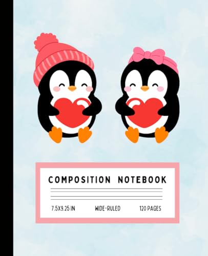 Cute Penguin Pair Composition Notebook: Adorable Boy and Girl Penguins Holding Hearts - Wide Ruled | 7.5" x 9.25" | 120 Pages for Kids, Girls, Boys, and Kawaii Animal Fans