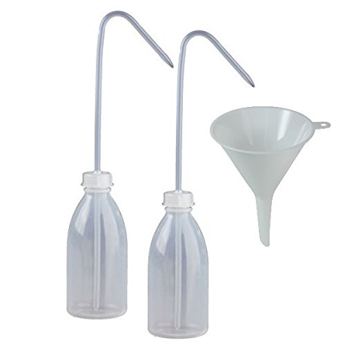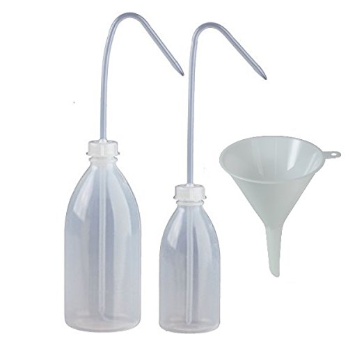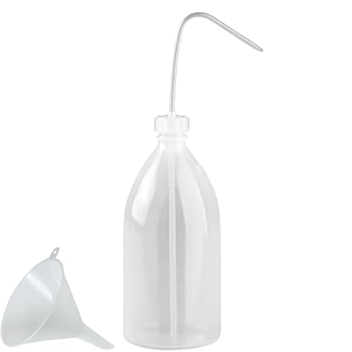 Uppsättning av 2 laboratorieflaskor, tvättflaska, 1 x 250 ml och 500 ml av plast BPA-fri – tillverkad i Tyskland – inkl. påfyllningstratt