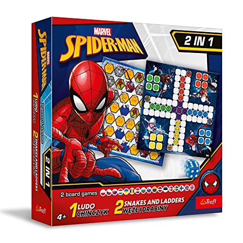 Trefl - Ludo, Stegen och Ormen - Spider-Man - 2in1 Brädspel för Familjen med Marvel Superheroes, Dubbelsidigt Bräde, Enkla Regler, Klassiskt Brädspel för Vuxna och Barn Från 4 år och Uppåt
