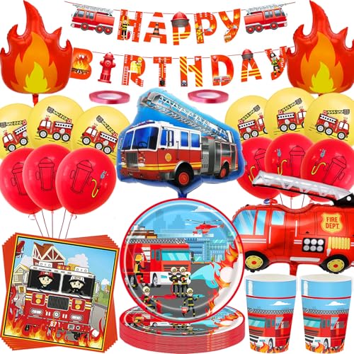 Brandbil födelsedag dekorationsset, 80 stycken brandman festservis med stor folieballong partytillbehörsset, brandman papperstallrik, koppar, servetter, banner, luftballong, barn, fest, dekoration, 20