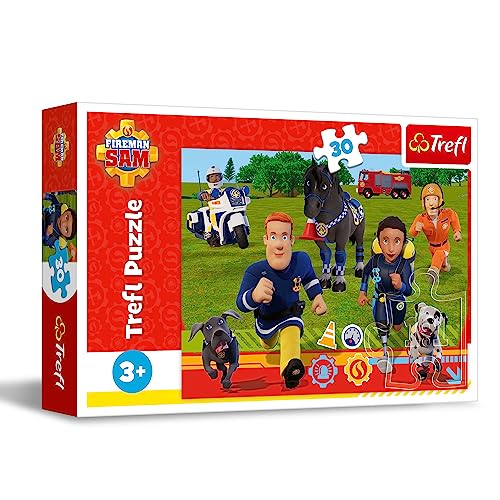 Trefl - Fireman Sam, Redo att hjälpa" - Pussel 30 bitar - Färgglada pussel med sagans karaktärer, Brandbil, Räddningsteam, Kreativ underhållning, Lek för barn från 3 år