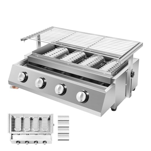 ROGONPDK Gasgrill, 4 brännare, rostfritt stål, brännare, LPG Gastro BBQ bordsgrill, 4-lamm, LPG-gasgrill med avtagbar grill, 58 x 40 x 20 cm